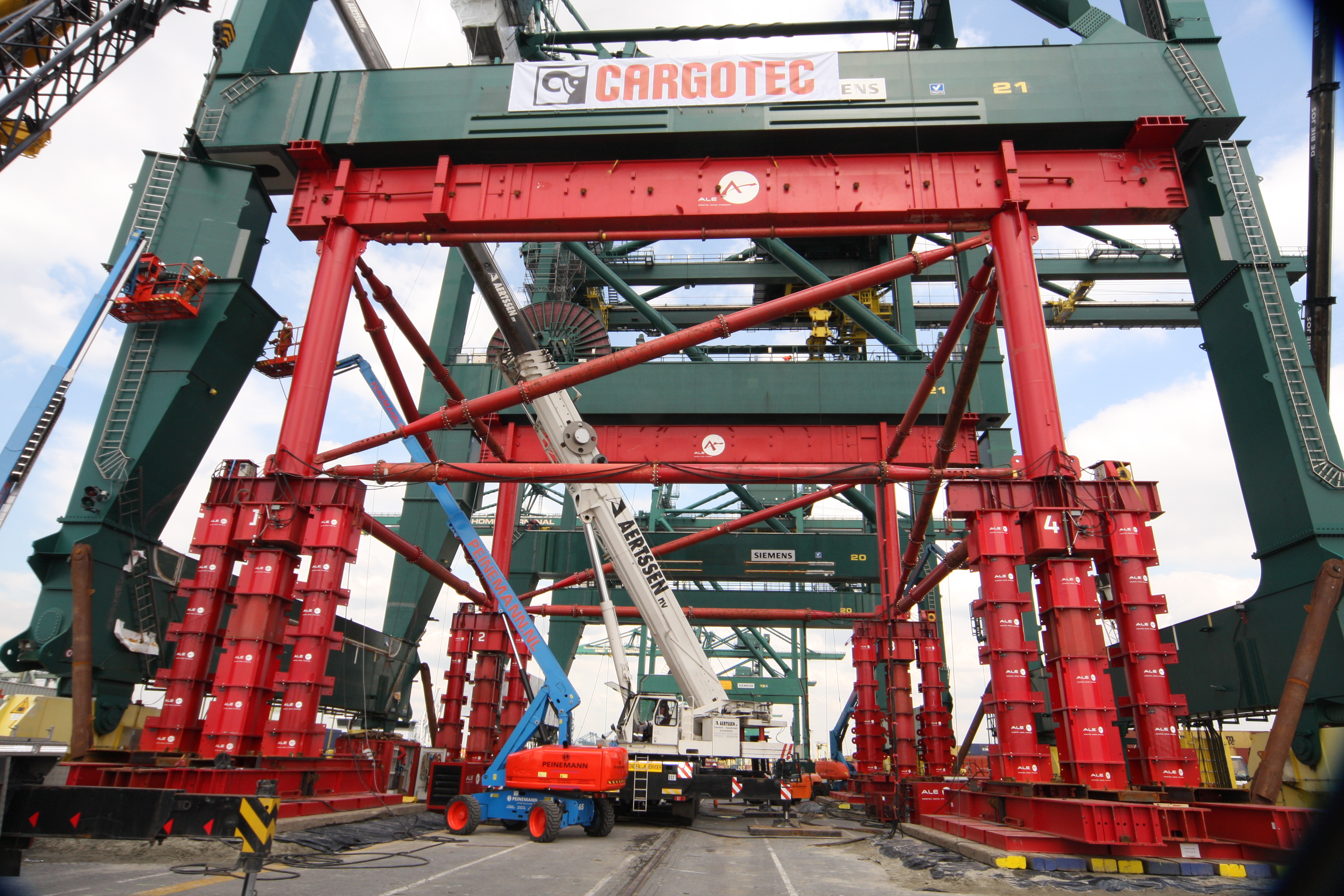 The highly specialised technique involves jacking the crane and inserting a heightening construction just below the gross girders.  In order to maintain the rigidity or stiffness, the sill beam is strengthened and bracers are installed at the waterside portal frame. This process enables the crane height to be increased by four meters.