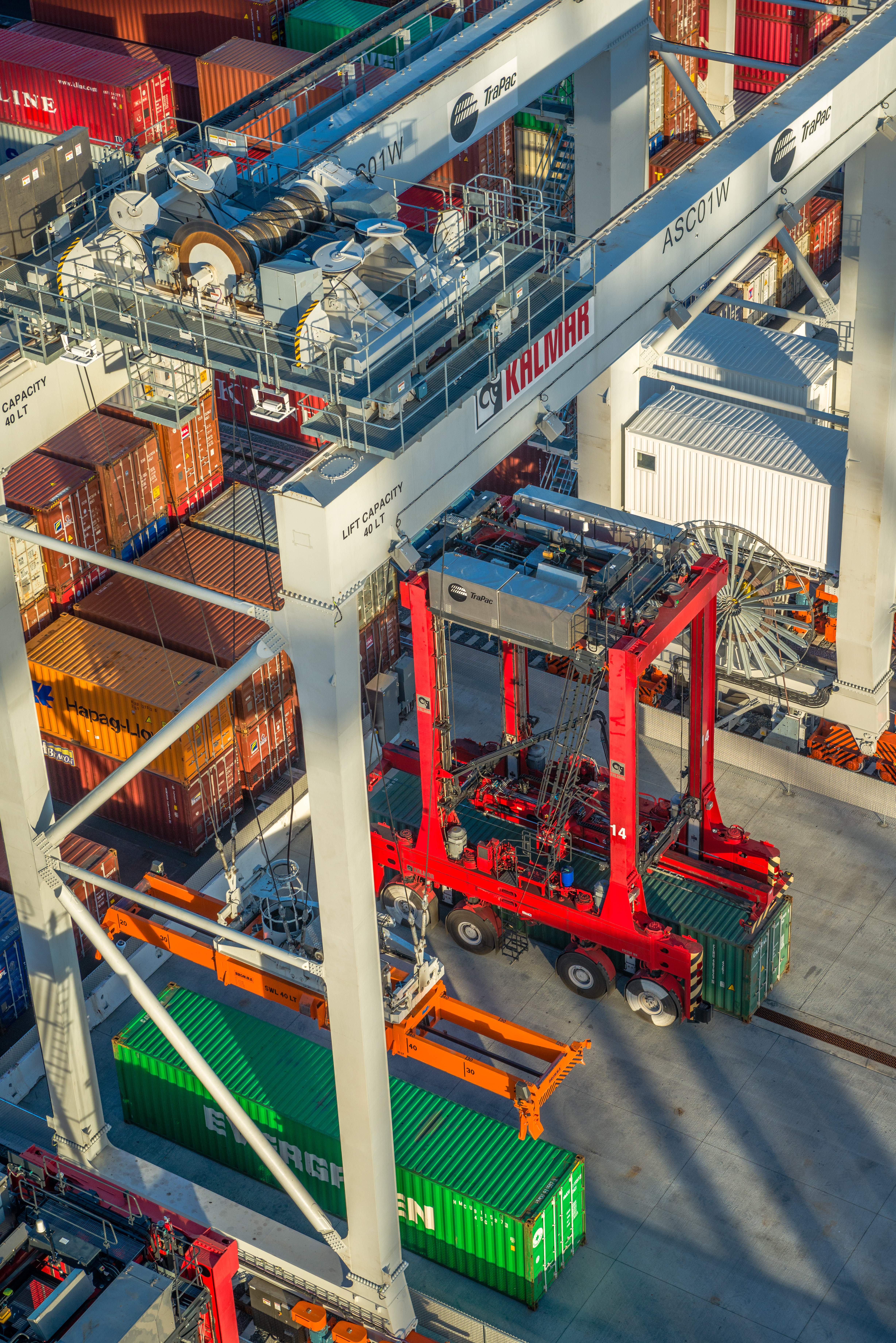 End-to-end efficiency is achieved at TraPac's terminal through a combination of Kalmar automated stacking cranes, automated straddle carriers and automated truck handling, all integrated to operate in an optimal manner with Kalmar terminal logistic system. Conversion to automation has been done step by step maintaining both the existing manned operations and automated container handling operations while carrying out the terminal development.