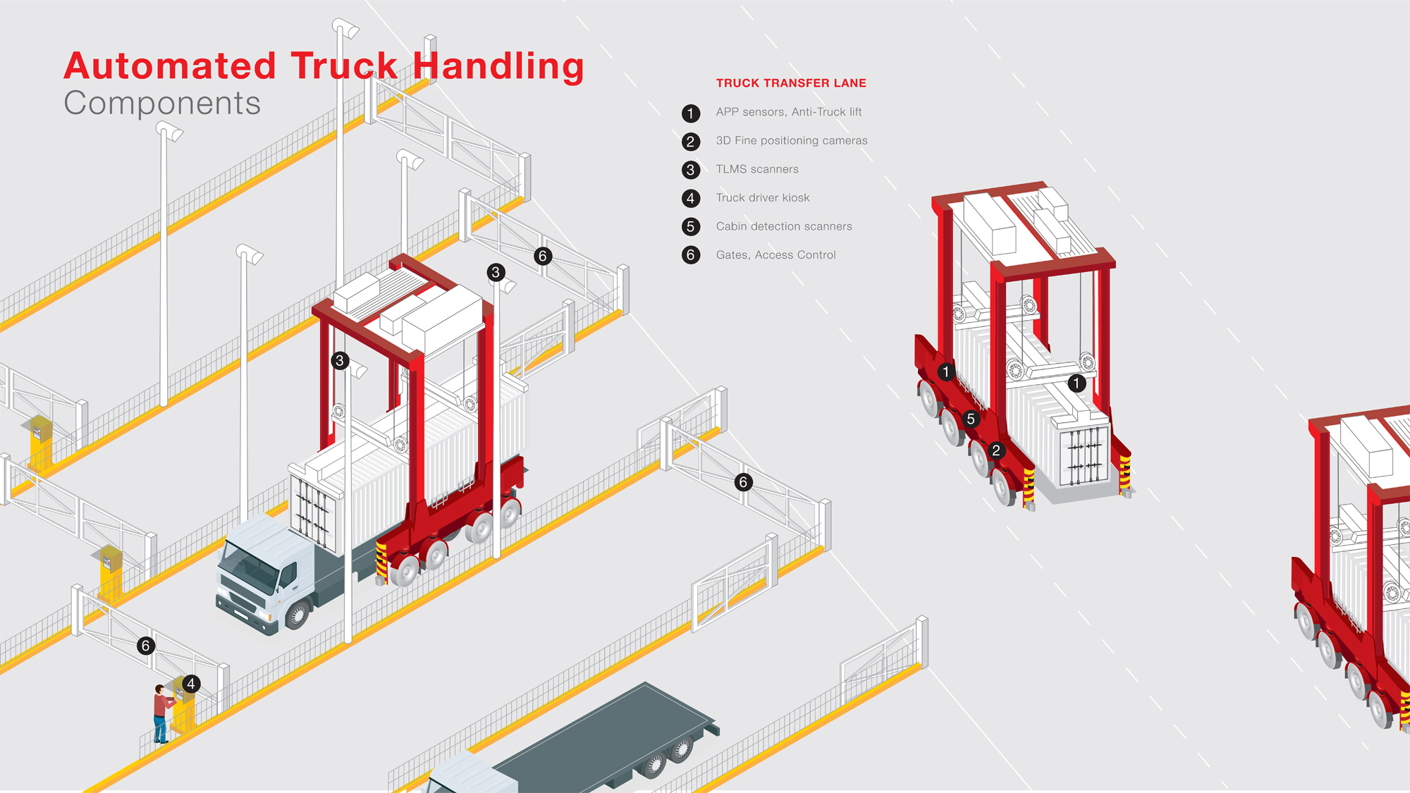 ATH automates the placement of containers from automated straddle carriers onto trucks in the terminal’s truck interchange zones. A Truck Lane Measurement System (TLMS) is used to measure the truck’s profile, location and the container positions available, while a camera imaging system is used for fine positioning when placing the container onto the truck. ATH improves the safety, predictability and cost-efficiency of terminal operations by eliminating the need for personnel to be present in the truck interchange zones.