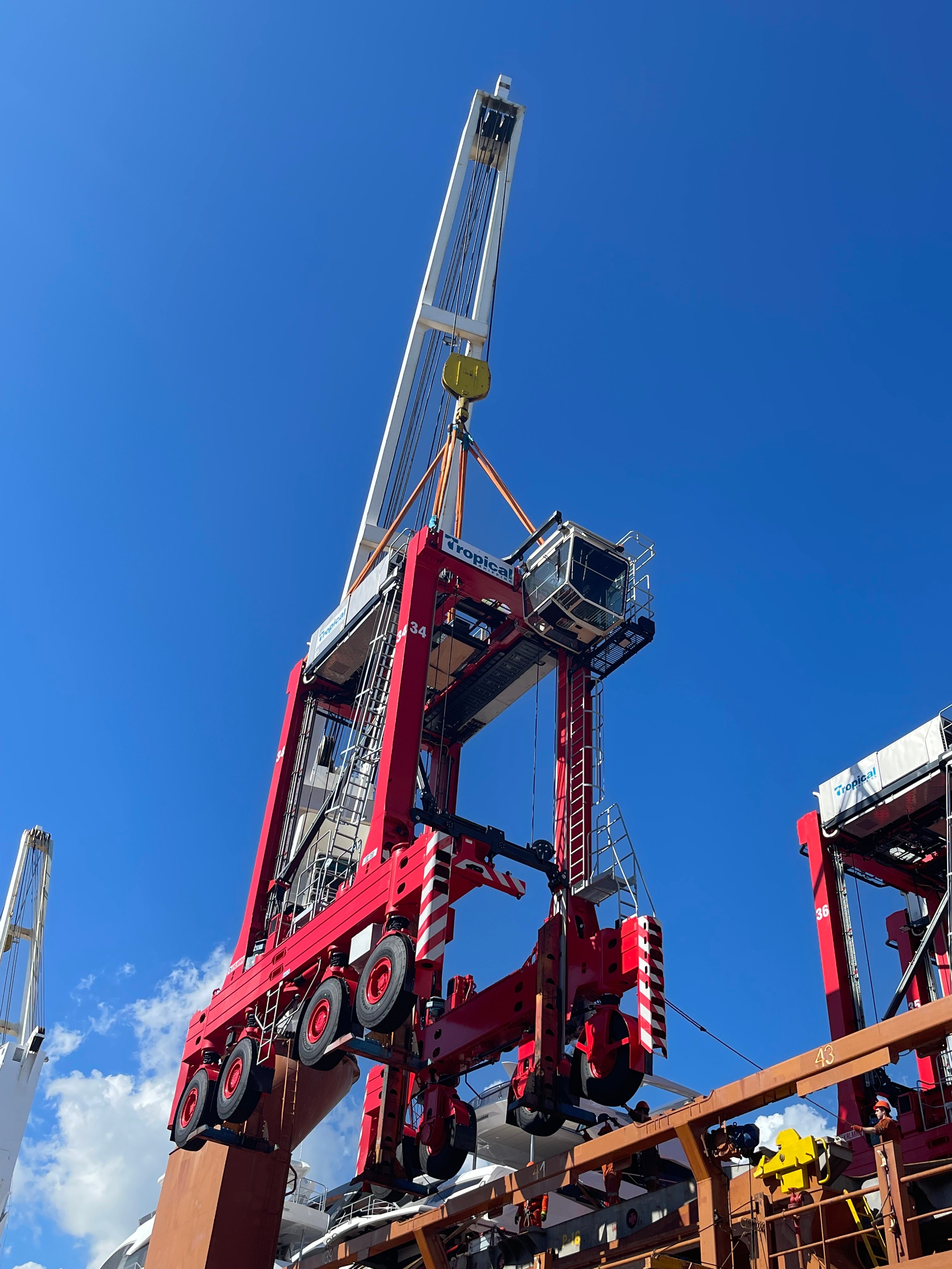 One of the new straddle carriers will be a special width unit specifically dedicated to rail operations. In 2020, the Port of Palm Beach received a federal port infrastructure development grant to improve the intermodal capacity. This Kalmar Straddle Carrier will be an integral piece of equipment to help double the rail output capacity at the on-dock rail facility.